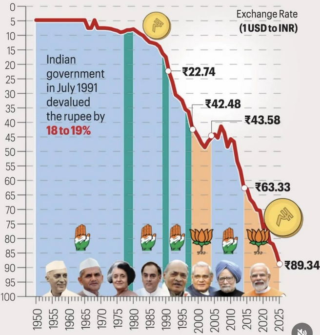 காங்கிரஸ் ஆட்சி காலத்தில் இந்திய ரூபாய் தனது பெறுமதியை இழந்தது போலவே பா.ஜ. ஆட்சி காலத்திலும் வீழ்ச்சி அடைகிறது. 2015ம் ஆண்டில் மோதியின் பா.ஜ. ஆட்சியை கைப்பற்றியபோது ஒரு டாலருக்கு 63.33 இந்திய ரூபாய்கள் மட்டுமே கிடைத்தன. அனால் தற்போது 90.00 ரூபாய்கள் கிடைக்கின்றன.