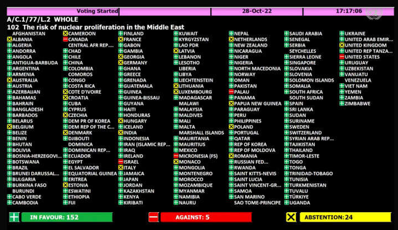 இந்நிலையில் வெள்ளிக்கிழமை ஐ. நாவில் இஸ்ரேல் அதன் அணு ஆயுதங்களை கைவிடல் அவசியம் என்று கூறும் தீர்மானம் ஒன்று பொது சபையில் வாக்கெடுப்புக்கு விடப்பட்டது. அணு ஆயுதம் அற்ற மத்திய கிழக்குக்கு இந்த இஸ்ரேலின் அணு ஆயுதங்களை களைதல் அவசியம் என்றும் வலியுறுத்தப்பட்டது.