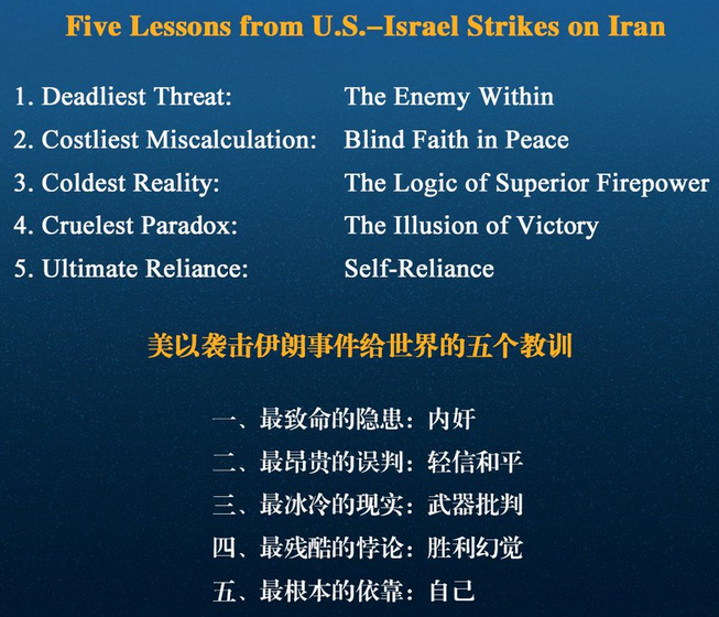 சீன இராணுவம் அமெரிக்காவும், இஸ்ரேலும் கூட்டாக ஆரம்பித்த ஈரான் மீதான தாக்குதல் 5 படிப்பினைகளை வழங்கி உள்ளன என்று இன்று தனது X பதிவில் கூறியுள்ளது.