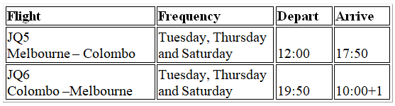 அஸ்ரேலியாவின் மலிவு விலை (low-cost) விமான சேவையான Jetstar 2026ம் ஆண்டு ஆகஸ்ட் மாதம் 25ம் திகதி முதல் அஸ்ரேலியாவின் மெல்பேர்ன் (Melbourne) நகருக்கும் கொழும்புக்கும் இடையில் கிழமைக்கு 3 நேரடி விமான சேவையை ஆரம்பிக்க உள்ளது.